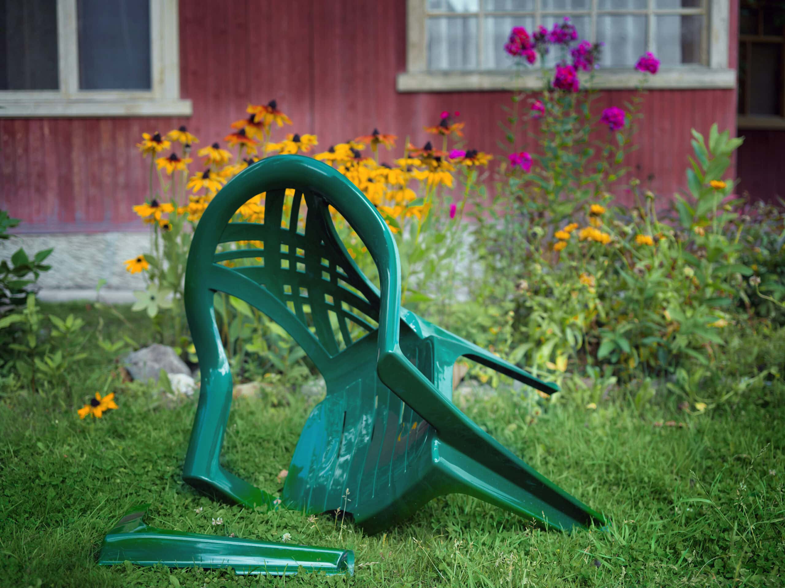 Abandoned plastic garden chair with broken leg, outdoor shot